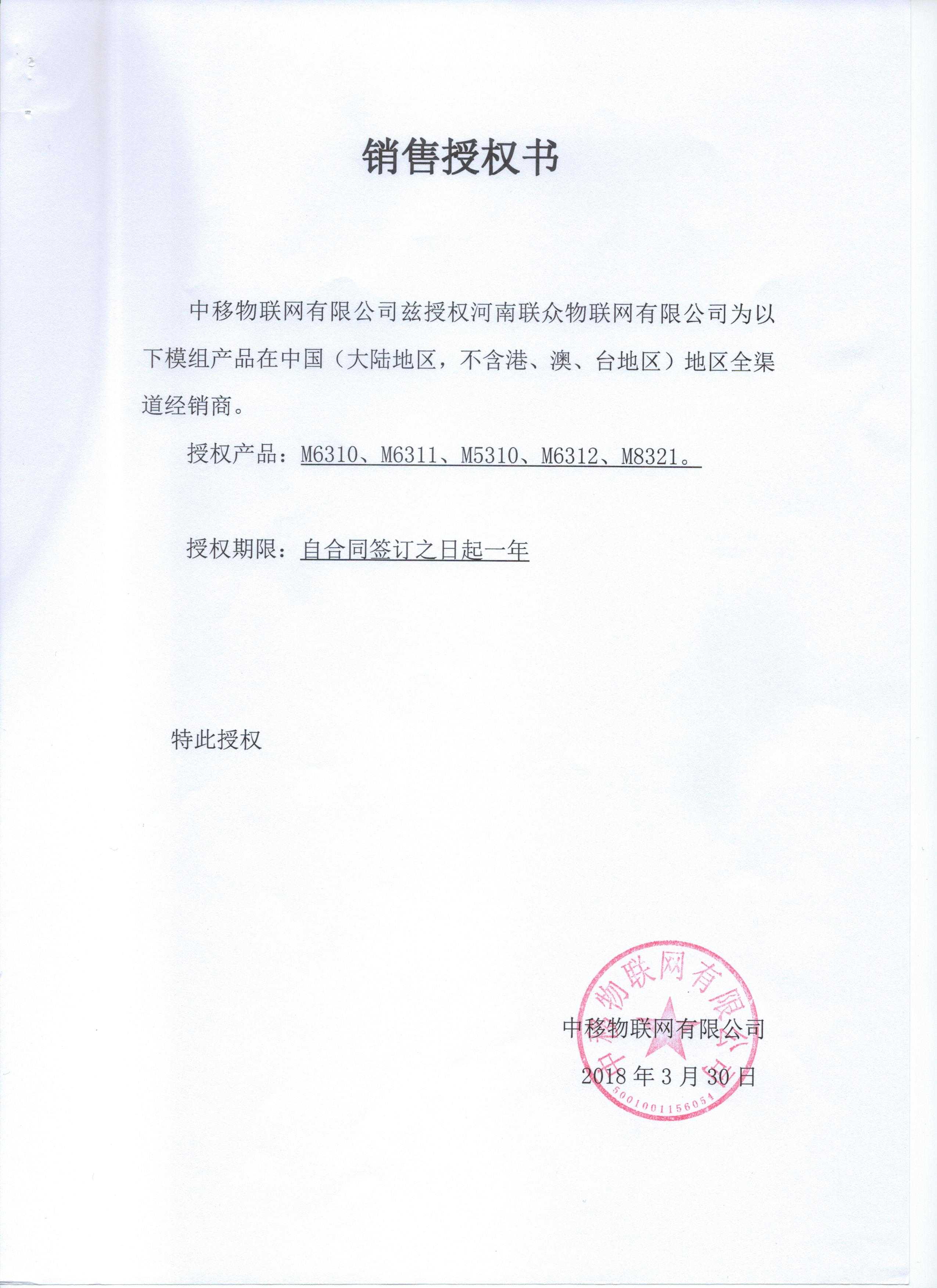 • 中移物聯授權書